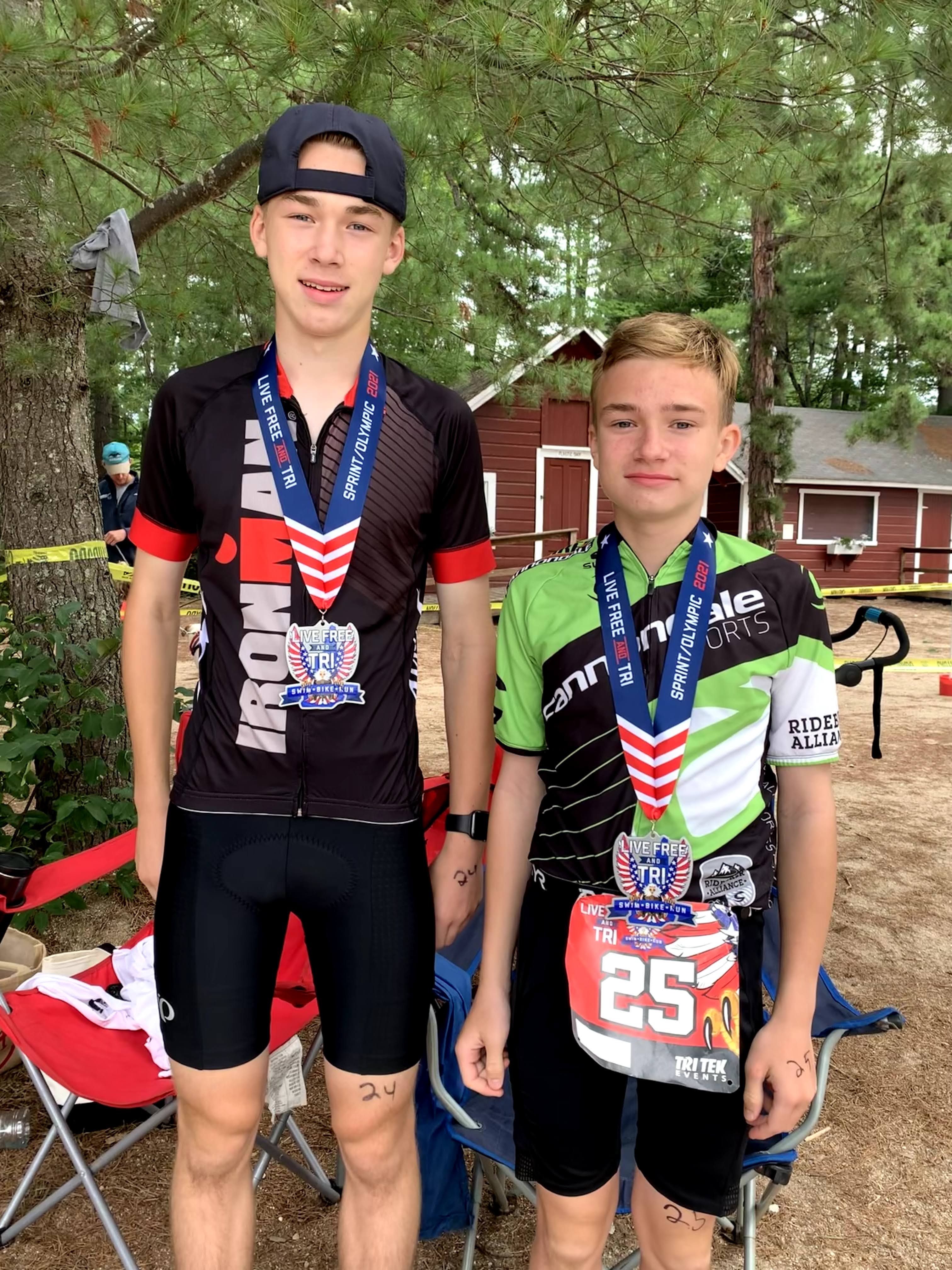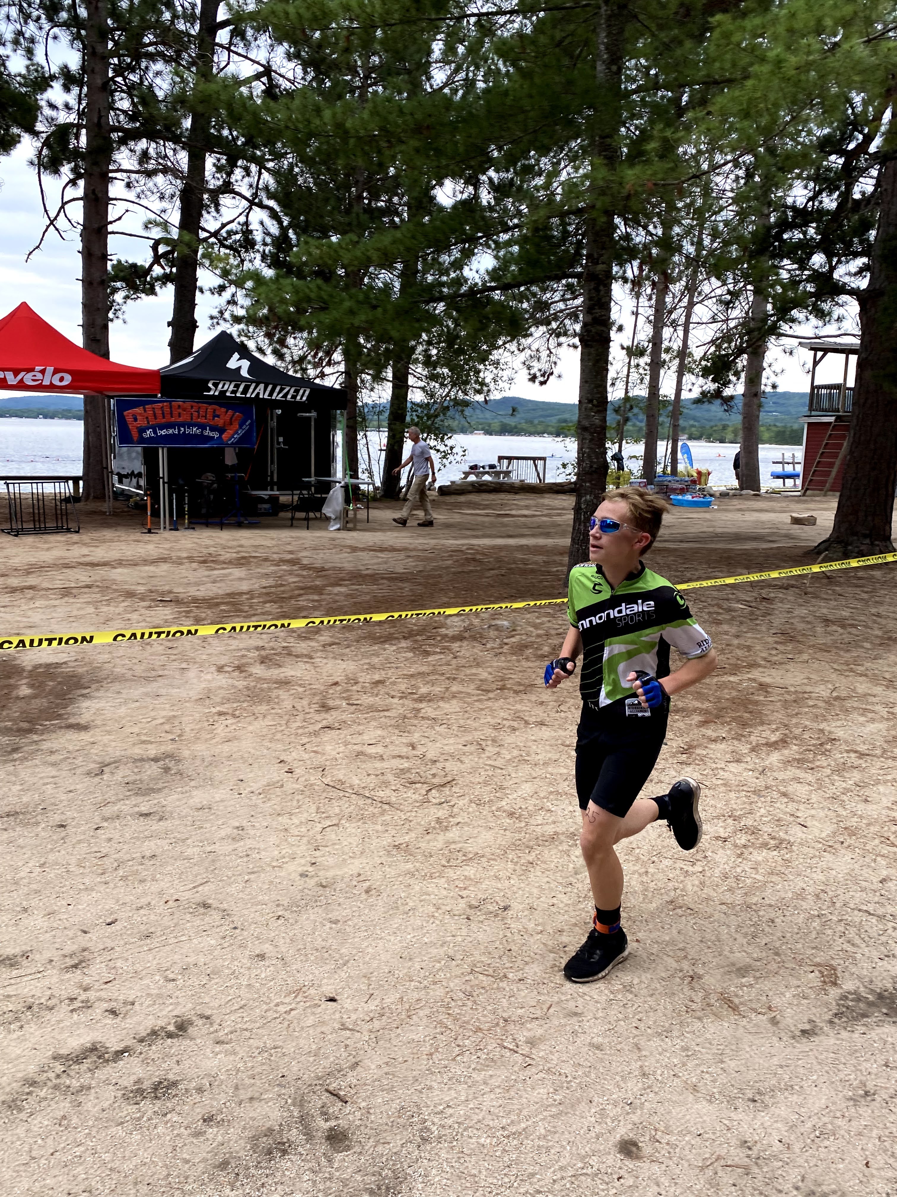 The alarm sounded in the black of night. Dawn was nowhere in sight, but the skillet sizzled while eggs cooked. Coffee brewed for Mom while she toasted an English muffin for Gavin. Mom softly tapped on bedroom doors informing Gavin and Brody their light breakfast was ready. Although their eyes were sleepy, they quickly approached the breakfast table. Bikes were mounted in the chilly morning air while all the necessary gear was loaded into the car. At 4:46am AFR was on the road to Freedom, NH for the Live Free & Tri duathlon. After several ninety degree days, the mid-sixties temperatures felt chilly, but Gavin and Brody enjoyed the more comfortable racing conditions. The race was staged on Ossipee Lake which provided gorgeous views. Our hilly neighborhood prepared Gavin and Brody for running on this mountain-based course. This was Gavin’s first race cycling with cleats. His natural ability coupled with his cycling enhancements provided him more power on the climbs. Mom and Dad volunteered to collect timing chips which allowed them to greet Gavin and Brody as soon as they crossed the finish line. Chase faithfully rang the cowbell giving his brothers the last bit of needed motivation as they approached the finish line. Twenty-three duathletes competed in this race. Gavin placed third in the men’s division and overall; Brody placed seventh in the men’s division and eleventh overall. They continue to grow stronger and improve their times! Following the race, we enjoyed a hearty lunch at the Yankee Smoke House.