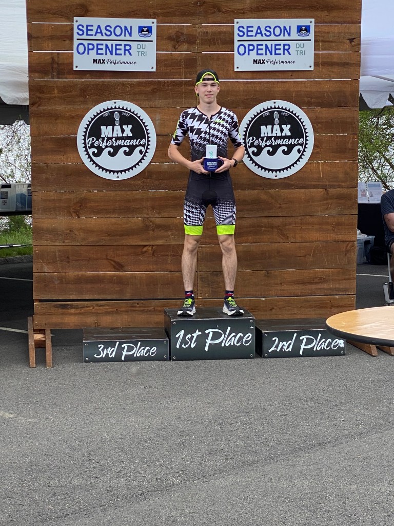 On Sunday, May 15, 2022, Gavin competed in the Season Opener Du/ Tri sprint distance duathlon in Hopkinton, MA. He embraces any opportunity to race– especially races he has not yet competed in. Eighty-seven athletes participated. This race presented an interesting mix of seasoned racers and many at the beginning of their racing journey. Repeatedly announcing that bikes are NOT to be ridden in the transition area proved that many were new to the sport. It’s great to see interest growing! As an experienced racer, Gavin’s performance was strong and steady with an impressive finish time of 1:04:45. He was pleased with his first run time averaging 6:03! Additionally, we saw improvement in his transition times. Not only has he decreased his transition time, but he began passing other racers in transition as well. His excellent pace earned him fourth place for the overall finish and first place in his age category.